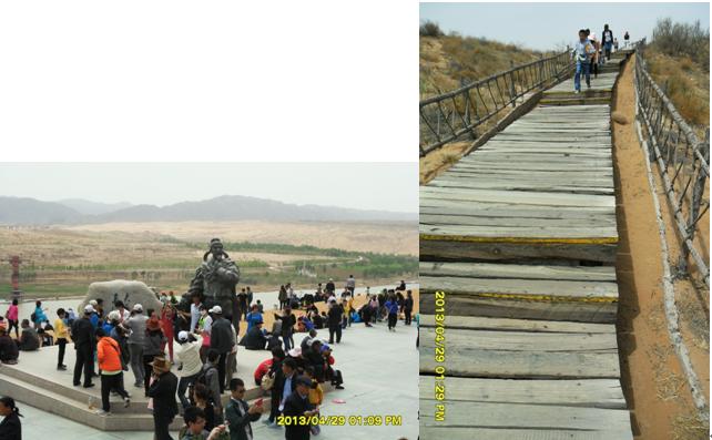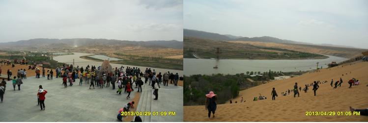 沿著黃河?xùn)|岸,由南向北,走在河岸邊的木質(zhì)人行棧道上,微風(fēng)輕拂,游客熙熙攘攘。棧道下面,不時發(fā)出一陣陣黃河浪拍打岸邊卵石的聲音,棧道西側(cè)是廣際的黃河河面,沙坡頭特有的羊皮筏子載著游客,順著主河道東側(cè)漂流而過,偶爾漂入浪谷,游客不時發(fā)出一些驚嚇聲;主河道及西側(cè),間或有旅游快艇飛馳而過,拉起一道道浪花。棧道東側(cè)是旅游觀光車的通道,乘坐觀光車每人次費(fèi)用20元,觀光車駕駛員兼講解員,沿途不停的向游客解說景點(diǎn)。路邊涼皮、涼面小攤,食物價(jià)格不菲,一份6元的涼皮、涼面賣到10元,一只4元的鹵雞腿售價(jià)7元,普通瓶裝健力寶等飲料賣到5元,比市區(qū)價(jià)格多出2元。